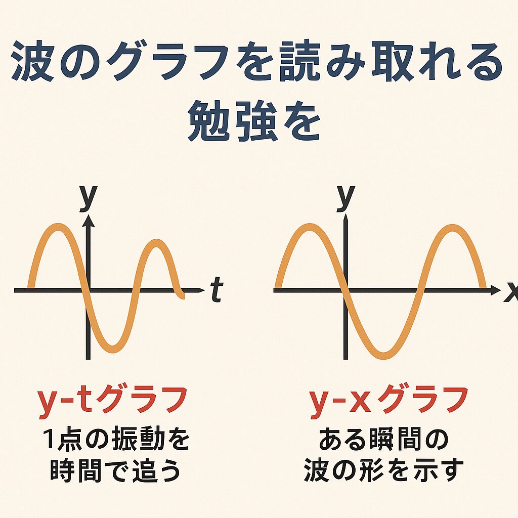波動では「y-xグラフ(位置と変位)」「y-tグラフ(時間と変位)」などがよく出てきます。
